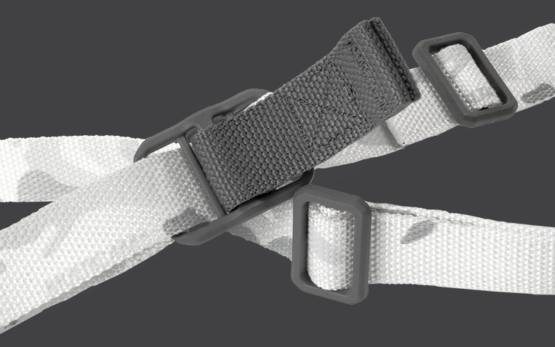 Quickly transition from carrying to combat-ready. Our patented Quick Adjuster lets you loosen or tighten the sling in seconds, so you can go from slung on your back to aiming downrange with a single swift motion. For the Alpine edition, we've outfitted the adjuster with a Wolf Gray pull tab and matching Wolf Gray nylon hardware. The gray tab provides a subtle contrast against the white MultiCam Alpine webbing, making it easy to spot and grab even with gloves on. In true VCAS fashion, this quick-adjust system bridges the gap between comfortable carry and rapid deployment – an essential feature when operating in chilly conditions where speed and dexterity are key.