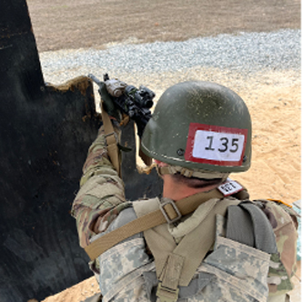 Soldier conducting record fire Qualification in combat equipment utilizing the M4 Modern Combat Sling Kit.