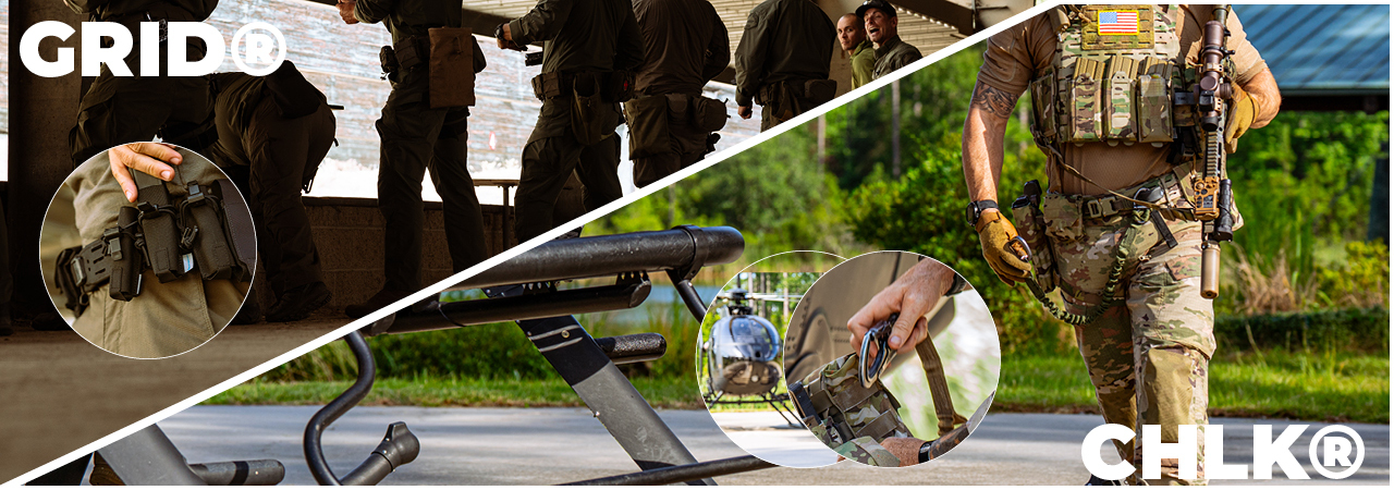 Typically, the minimum range belt setup will include a holster, magazine pouches, and a medical kit. Additional pouches like dump pouches or something to hold a multitool will be individual preference. When it comes to holsters, they should be mounted on the strong side. Blue Force Gear designed the Holster Adapter to work perfectly with the GRID and CHLK belts to keep the holster in the same position, preventing it from moving forward or backward when worn.