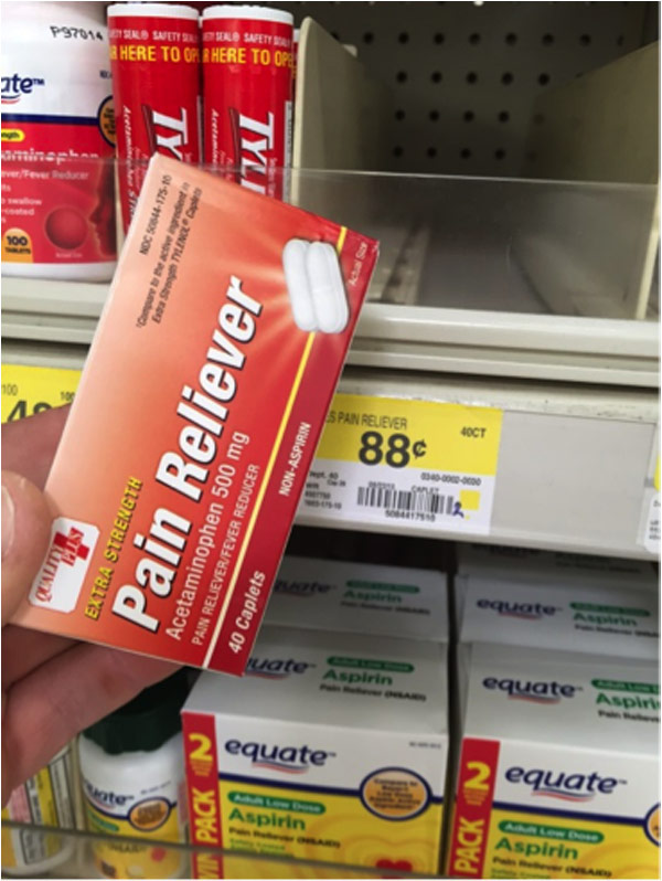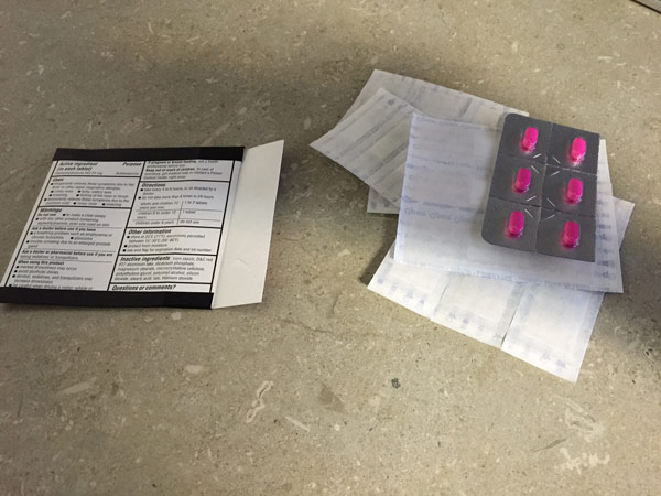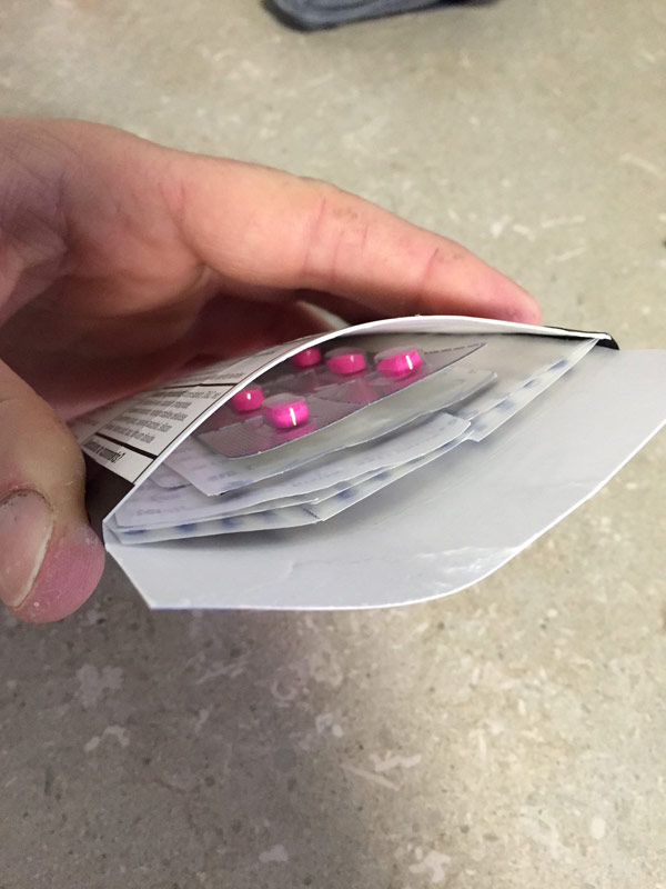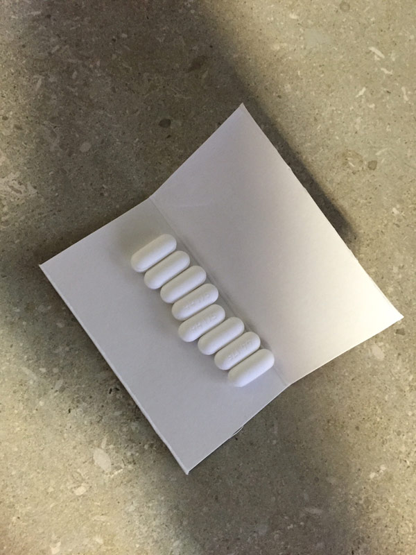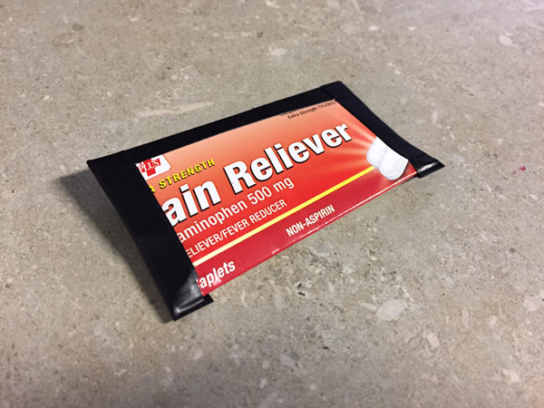 Tylenol® is good to have and I find that most of it usually goes to other people. For less than a dollar, this generic brand came in a big bottle that was too big to fit in the Boo Boo Pouch kit. I got creative and used some of the cardboard packaging to make a simple closed pouch.