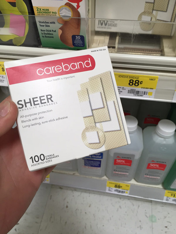 Often overlooked, simple Band-Aids® can save you from an untidy appearance caused by an unruly cut. This particular pack in the image had a variety of sizes, and after stocking my kit, there were enough left to store in a medicine cabinet or keep in a car or boat.