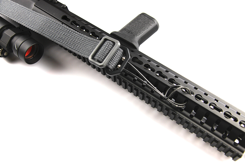 For the front, I girth hitched a 6.25” UWL through the slot in the KeyMod rail.  This creates an extremely lightweight attachment as I don’t have to purchase or install any other hardware onto the rail.  It is also very quiet and flexible.