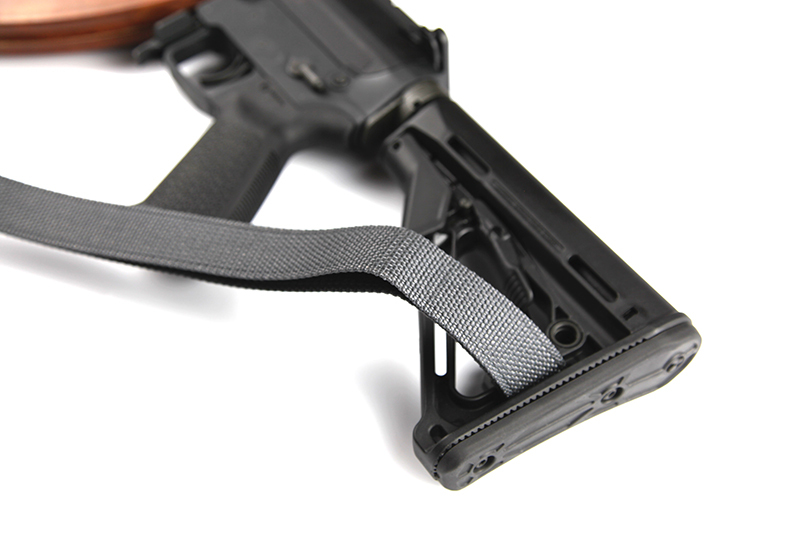 The gun is surprisingly light for its size so I went with unpadded Vickers Sling and Gray is just a cool sling color.  The back of the sling fit through the slot on the CTR stock and attaches with the two triglides.