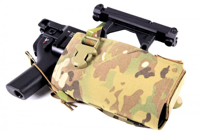 The M320 Holster is an ultralight holster for the HK M320 Grenade Launcher. The holster mounts to a 3 x 4 MOLLE field and can be mounted on the right side with the grip to the rear or left side with the grip forward. The holster is an open top design with an adjustable cross strap allowing for use with any sighting system. The bungee loop can be placed around the grip for additional retention. A unique feature built into the M320 Holster is its ability to lay flat when not in use to save space inside a pack, bag, or arms room.